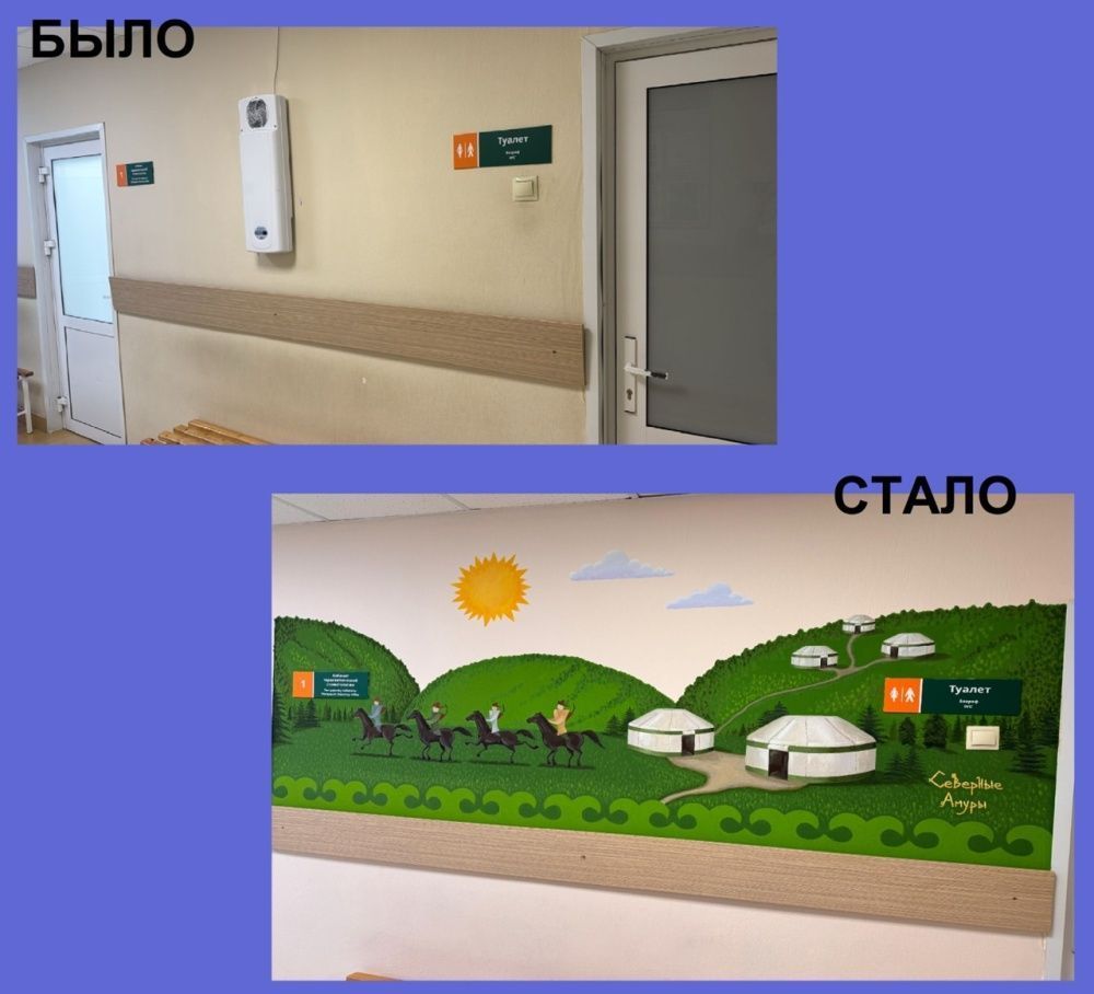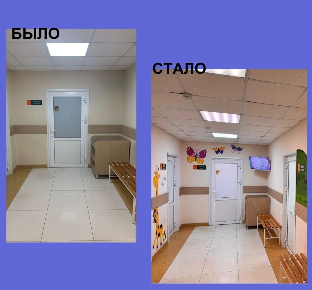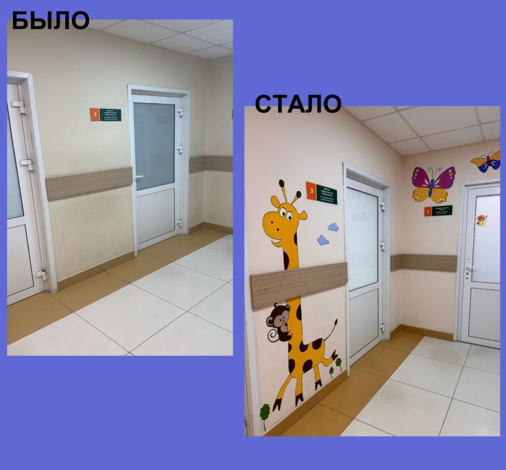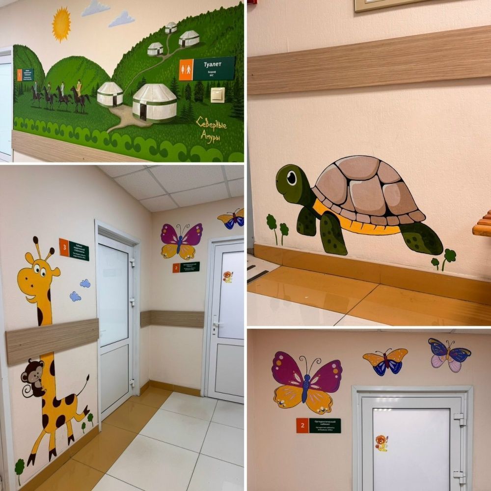 На первом обходе в нашей поликлинике мне бросилось в глаза унылое состояние и абсолютное отсутствие оформления зоны ожидания приёма в детском отделении. Спустя три с небольшим месяца мы это исправили, как уже и многое другое. Для наших маленьких пациентов установили телевизор и организовали красочное оформление стен по мотивам известного мультфильма "Северные амуры". Благодарю за проведённую работу художника, участника выставки современного искусства Art Heart Элину Халатаеву и куратора воскресных работ - заведующего детским отделением Айнура Ганеева.